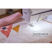 Oproti nižšímu modelu má stranový podavač - zoubky podavače umí podávat nejen dopředu a dozadu, ale taky vlevo a vpravo. Vlevo a vpravo umí šít rovný steh i cik-cak, takže na volné rameno navlečete nohavici a ušijete čtvereček. Dokonalé na přišívání záplat - už nebudete muset párat nohavici! Stranové podávání používá i pro šití ozdobných stehů, které jsou až 40 mm široké a písmenka abecedy má také větší, než nižší modely - jsou až 12 mm vysoká.