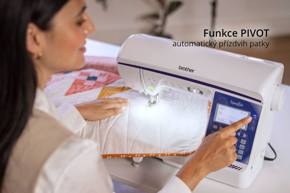Brother Inventio NV1850Q vás zaujme od prvního stehu! Funkce automatického zapošití a automatického odstřihu nitě je zde povýšena na další úroveň funkcí PIVOT - automatický přízdvih patky. Stroj na začátku šití zapošije, při každém zastavení zapíchne jehlu do látky a jemně přizvedne patku, takže vy můžete krásně otáčet na jehle, při sešlápnutí pedálu zase patku přitlačí a jede dál. Na konci šití stačí zmáčknout tlačítko zapošití a stroj zapošije, protáhne obě nitě do rubu, odstřihne je a zvedne patku. Vy jen vezmete materiál a jdete. Všechny tyto funkce samozřejmě jdou zapnout a vypnout. Velmi vám přitom šití urychlí a zpříjemní!