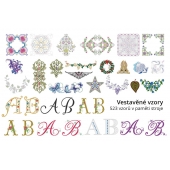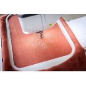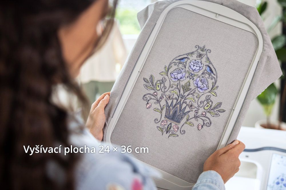 | Vyšívací plocha stroje je zvětšená na 24 x 36 cm. V základní výbavě pak najdete 2 rámečky velikostí 24 x 36 cm a 13 x 18 cm. | Máte k dispozici celkem 523 vyšívacích vzorů a 26 druhů abecedy v paměti stroje. | |