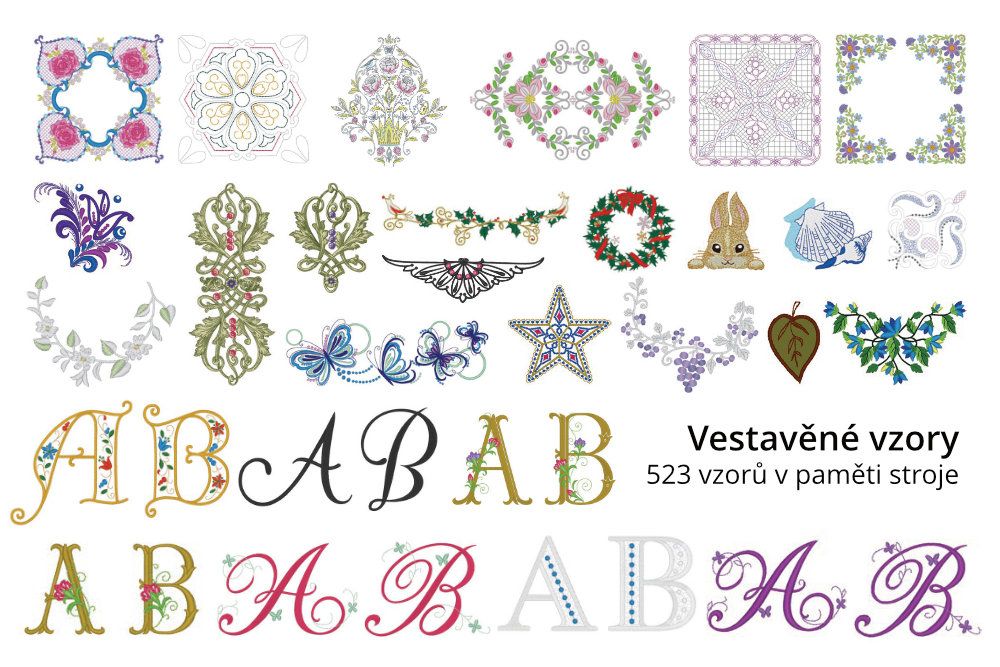 Stroj má v paměti 523 vzorů výšivek a 140 druhů orámování, ze kterých můžete vybírat výšivky pro své projekty. Přímo ve stroji je také 26 různých fontů písma, která můžete vyšívat bez použití počítače. Z toho 3 fonty písma jsou s českou diakritikou. Dalších cca 500 výšivek a 10 fontů najdete v aplikaci Artspira.